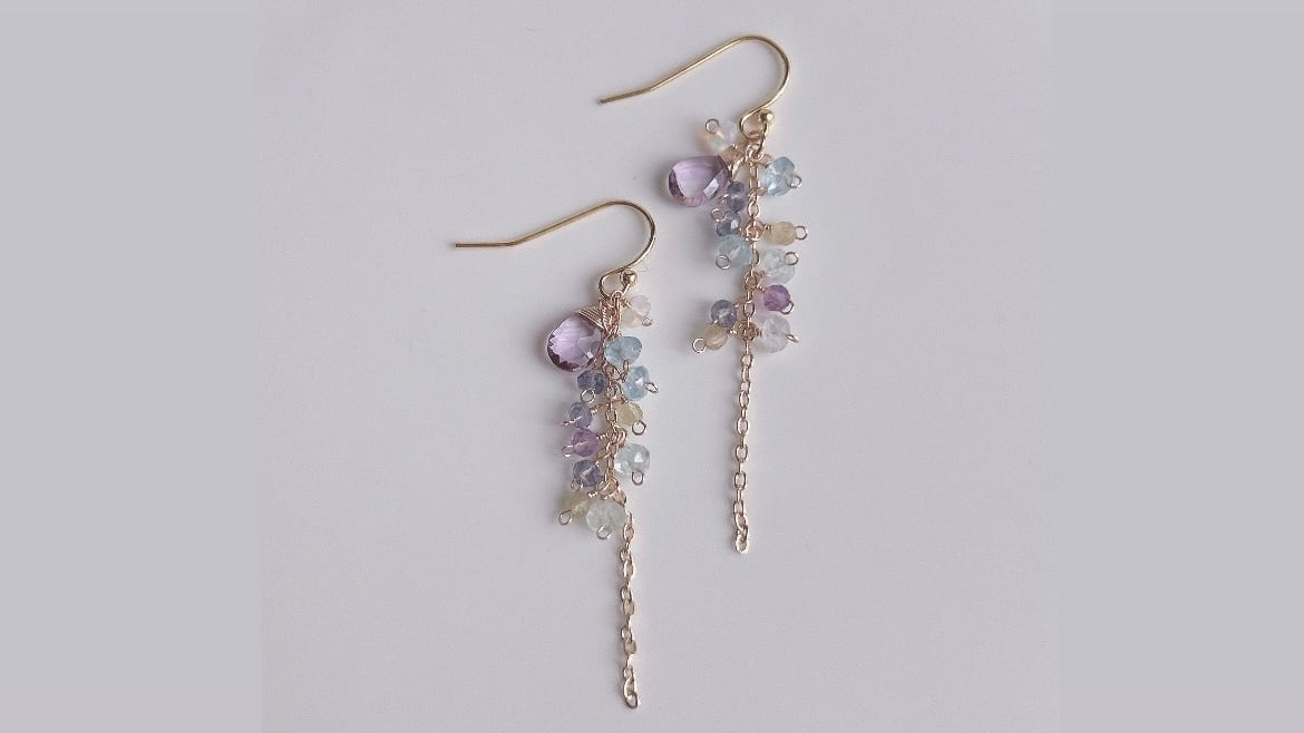 【14kgf】宝石質ピンクアメシストとアクアマリン、アイオライト、イエローオパール、エチオピアオパールのピアス/イヤリングꕤ
