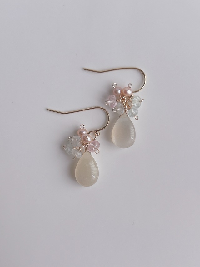 【14kgf】アクアマリンしずく&モルガナイト&レインボームーンストーン&ピンクパール ピアス/イヤリングꕤ