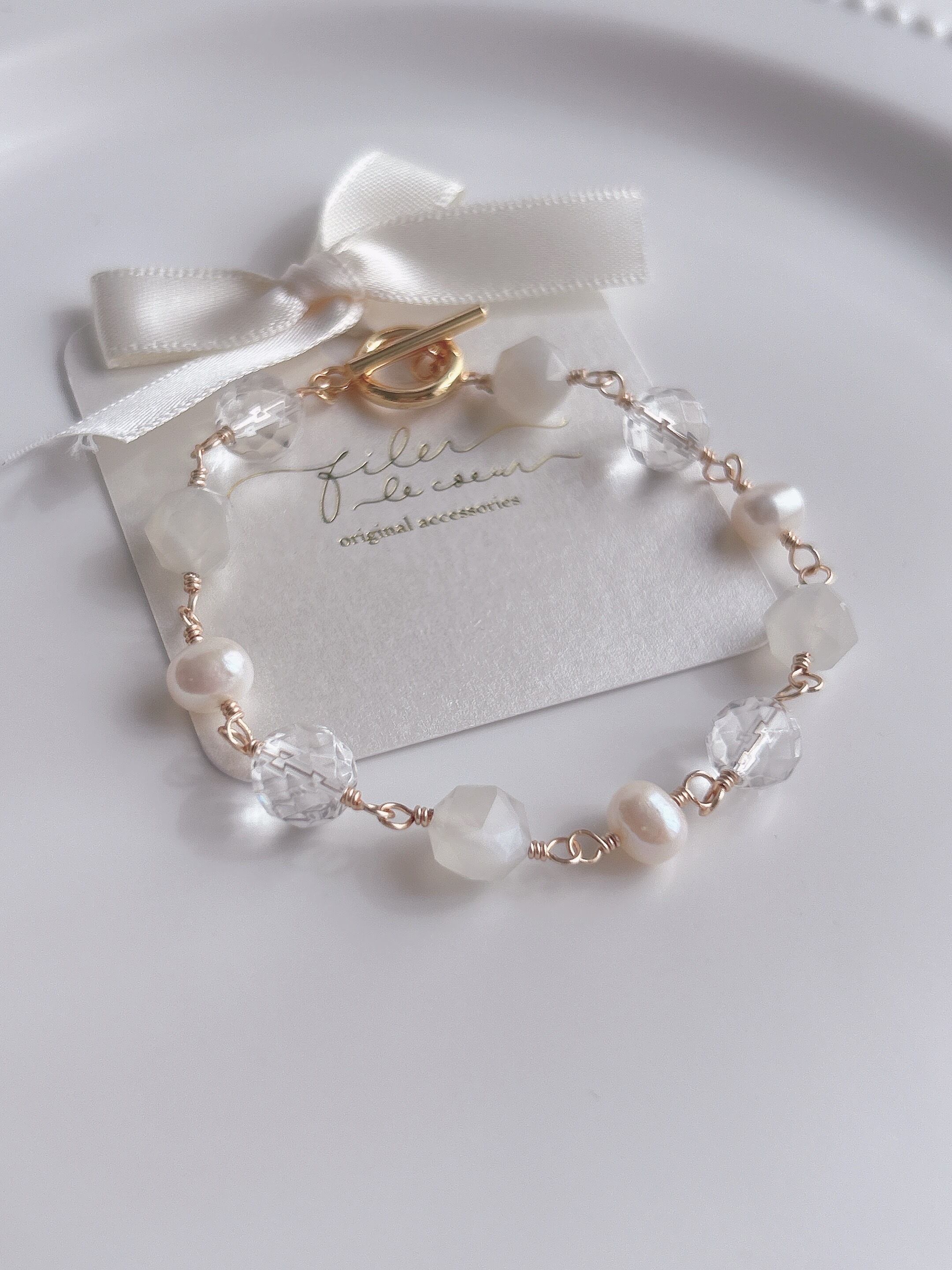 Restok!ホワイトムーンストーン、カット水晶、淡水パール ブレスレットꕤ