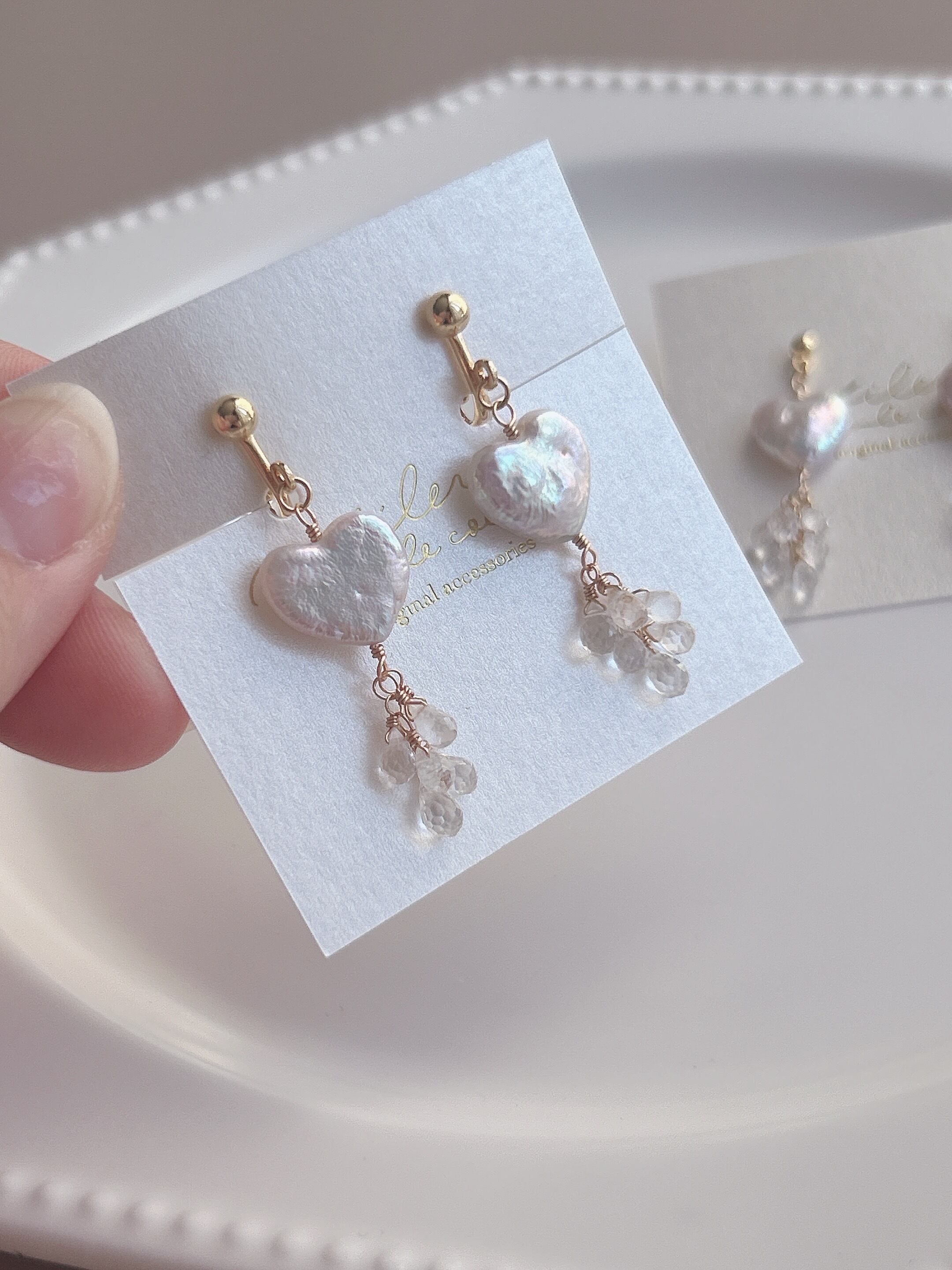 つやつやの淡水パールのハートシェイプとキラキラのホワイトトパーズのしずくを6石ずつあしらったデザインです。