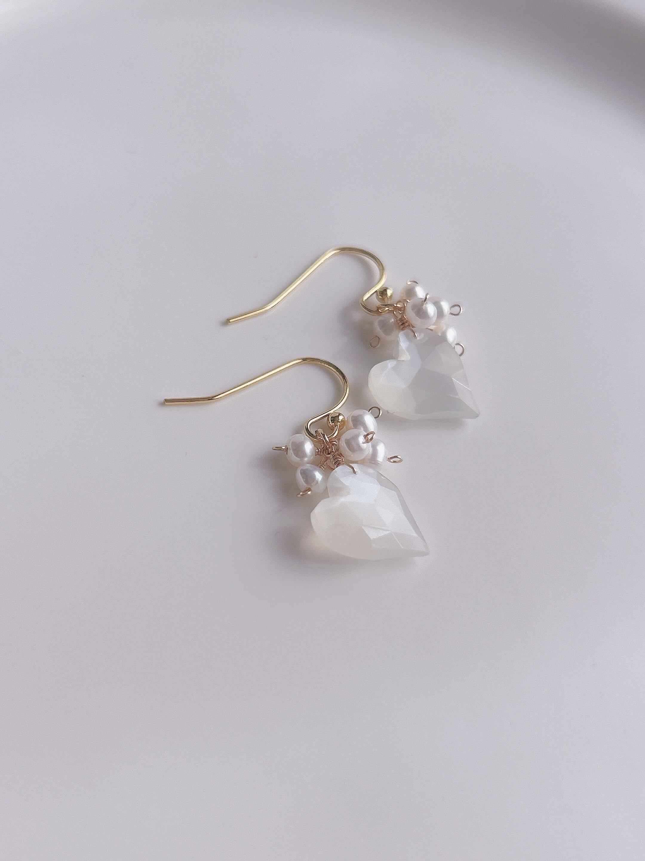 高品質ホワイトムーンストーンのハートカットをメインに、淡水パールを組み合わせたピアス/イヤリング。