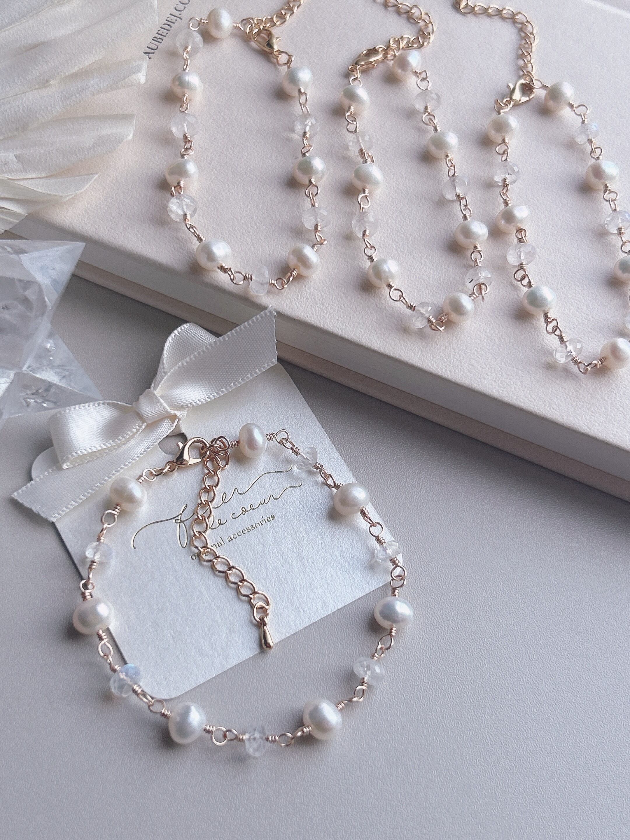 ブルームーンストーンと淡水パールが交互に織りなす、