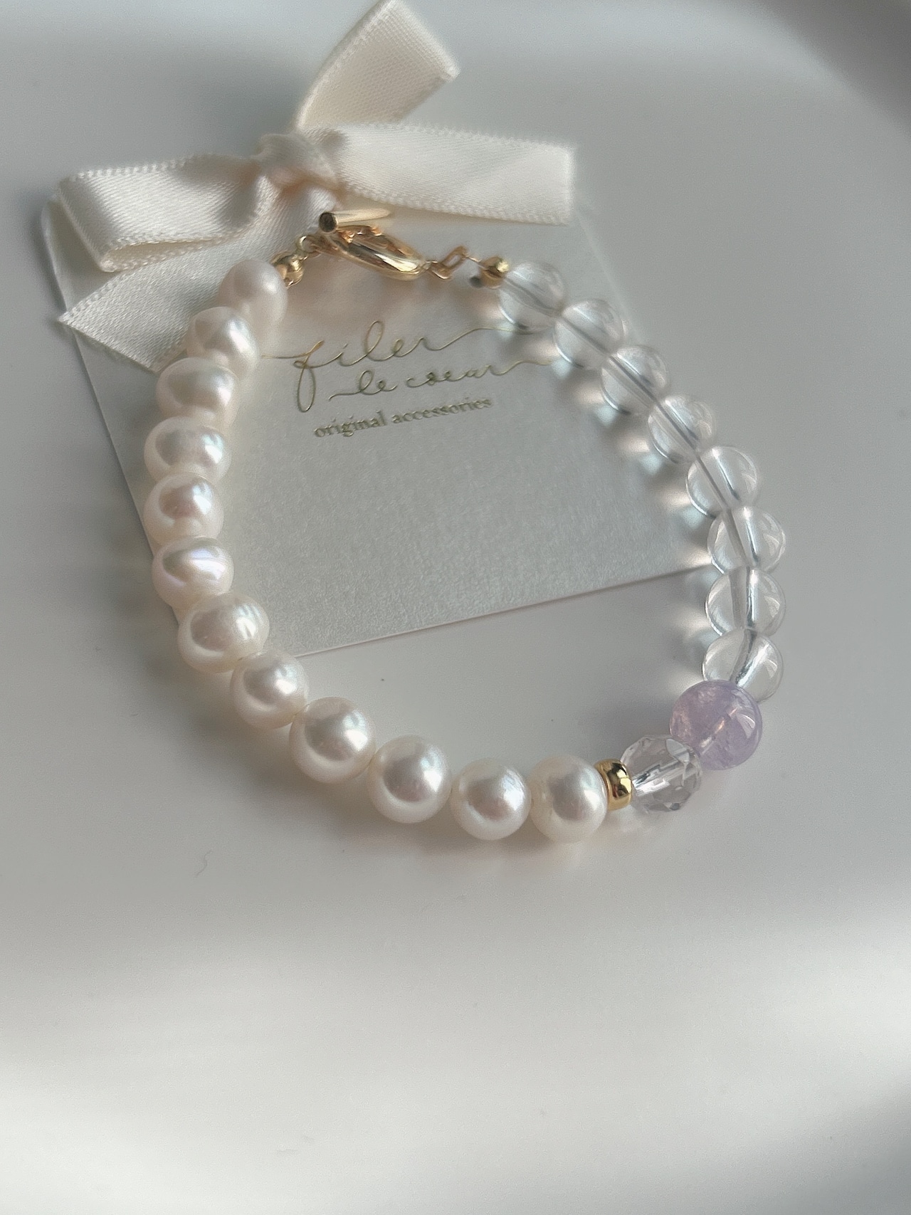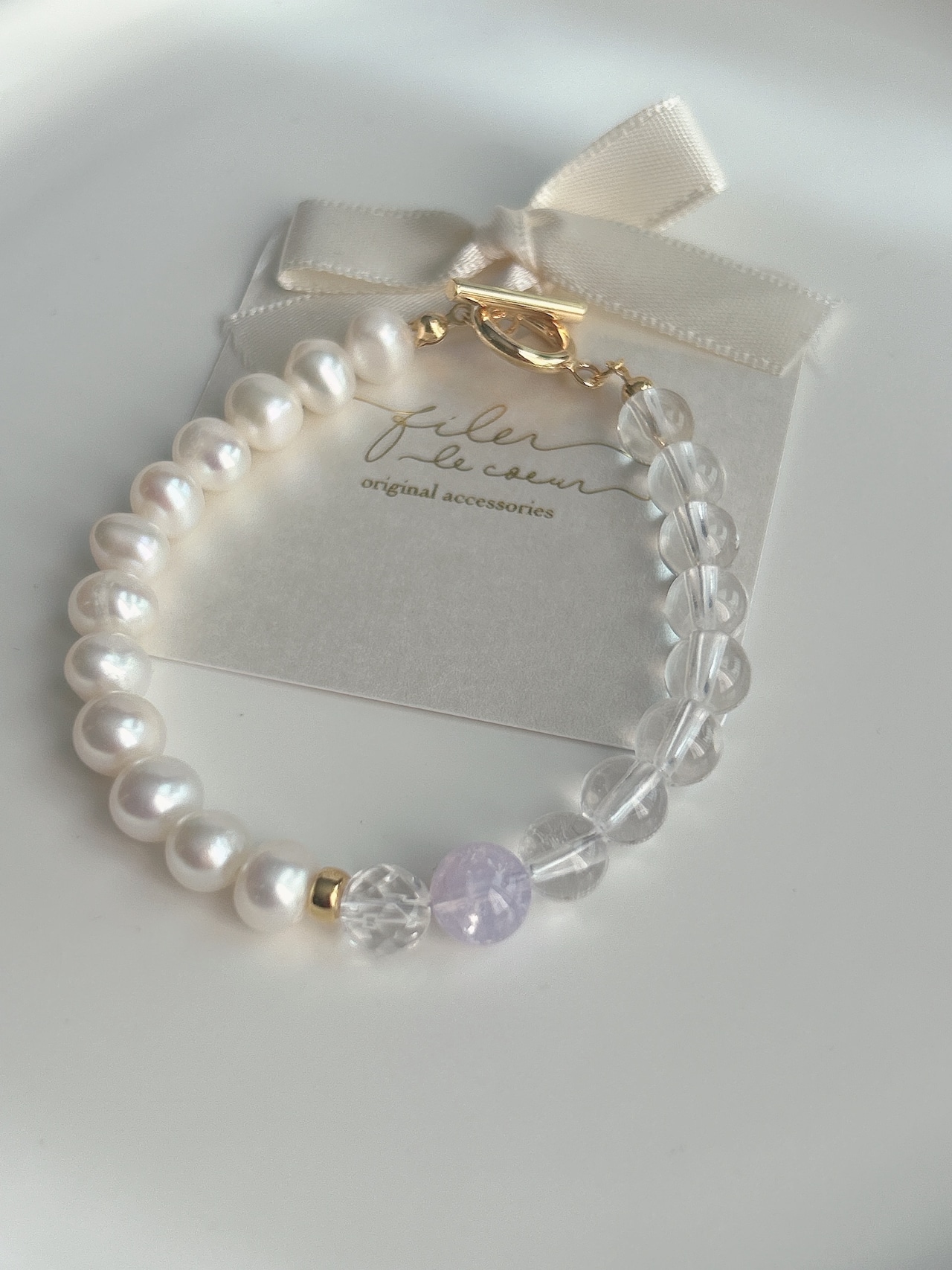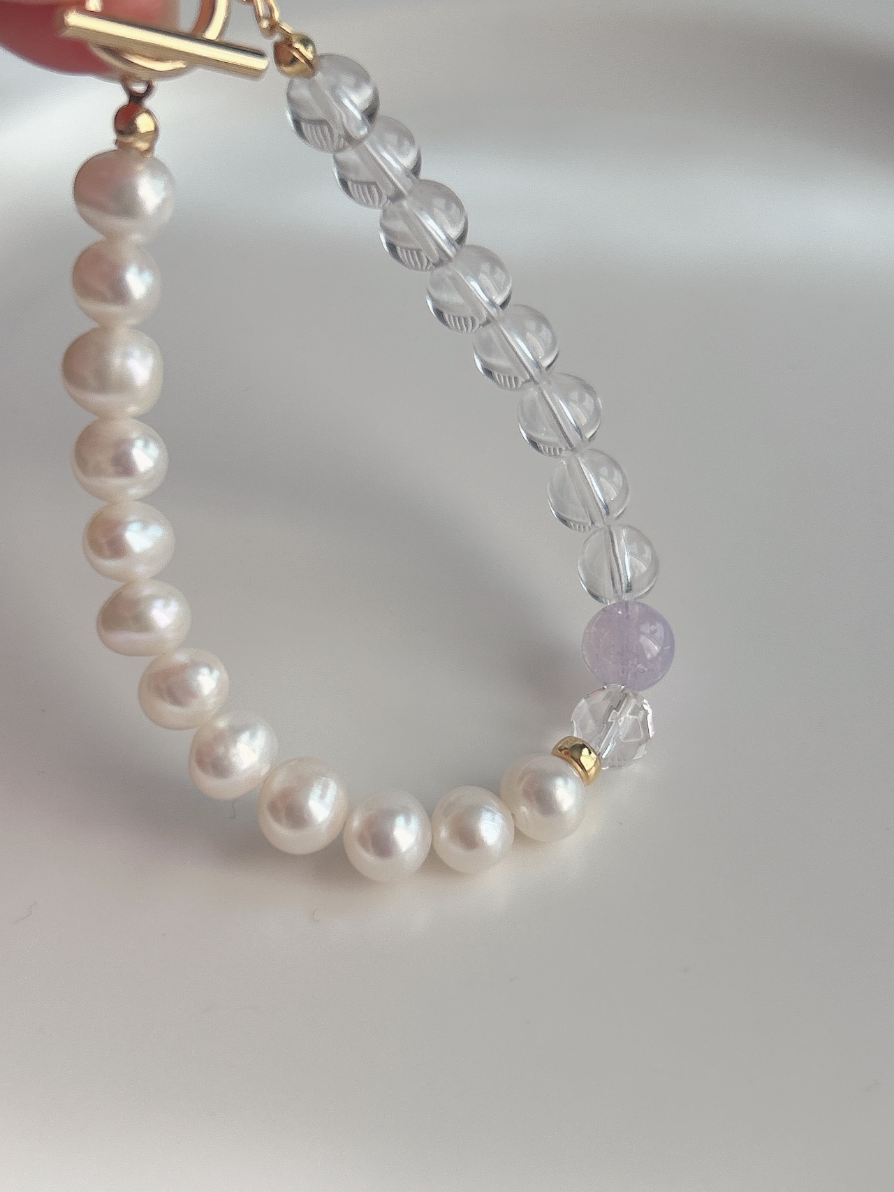 「透明感と優しさを纏う、淡水パール×水晶×スコロライトの癒しブレスレット」