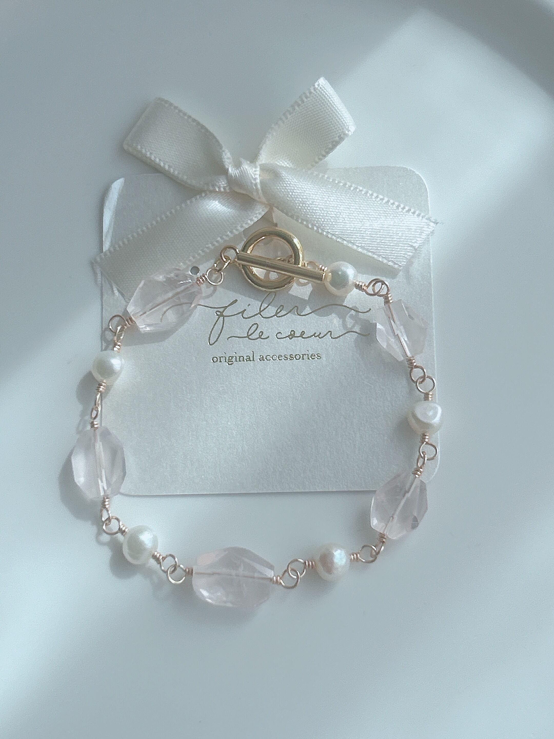 「優しいピンクの輝き、軽やかタンブルカットのローズクォーツ×淡水パールブレスレット」