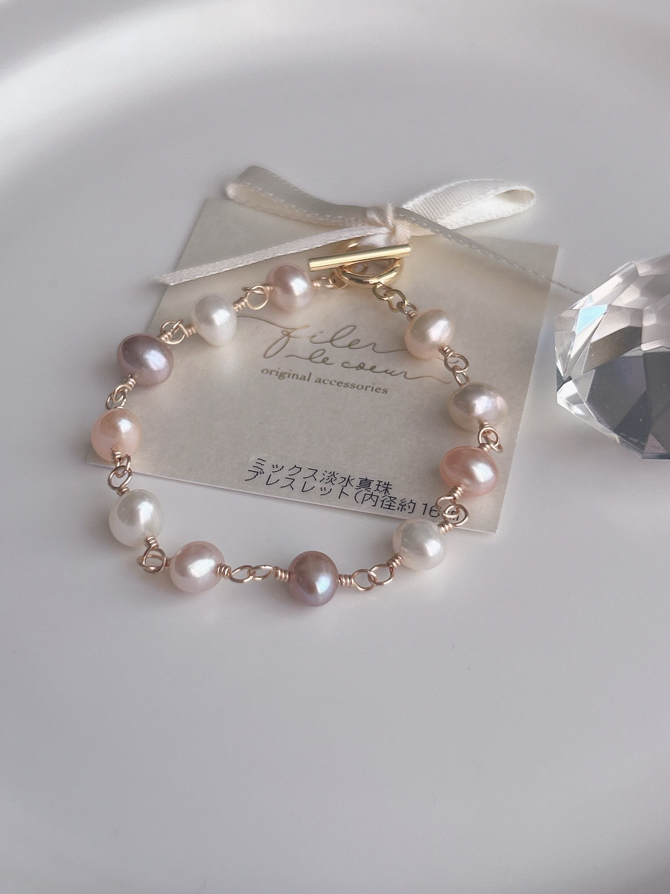 高品質♡淡い色に包まれたミックスカラー淡水パールブレスレットꕤ