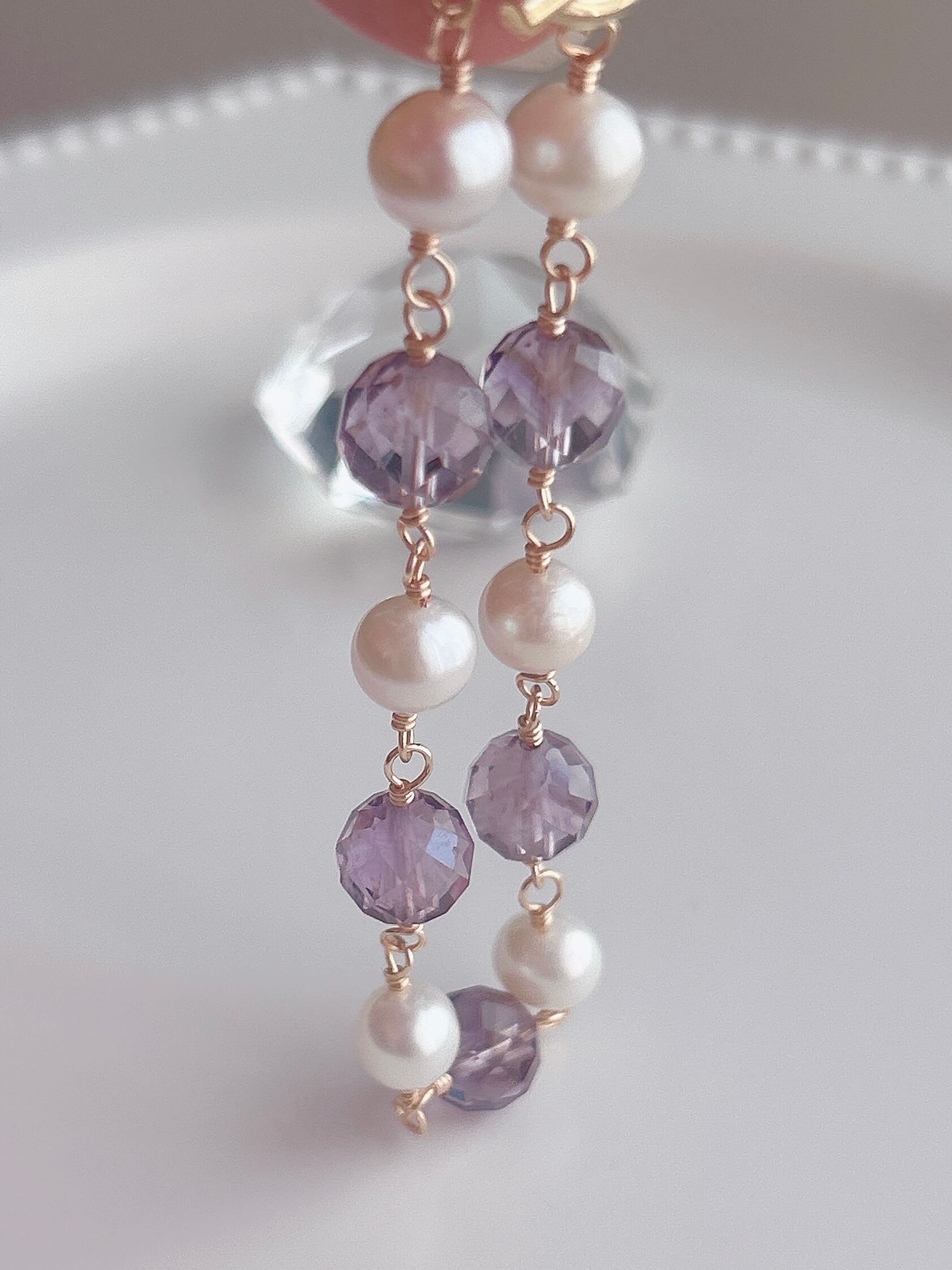 Restok!透明感あふれるラベンダーの輝き。ボリビア産64面カットアメシスト×淡水パールブレスレットꕤ