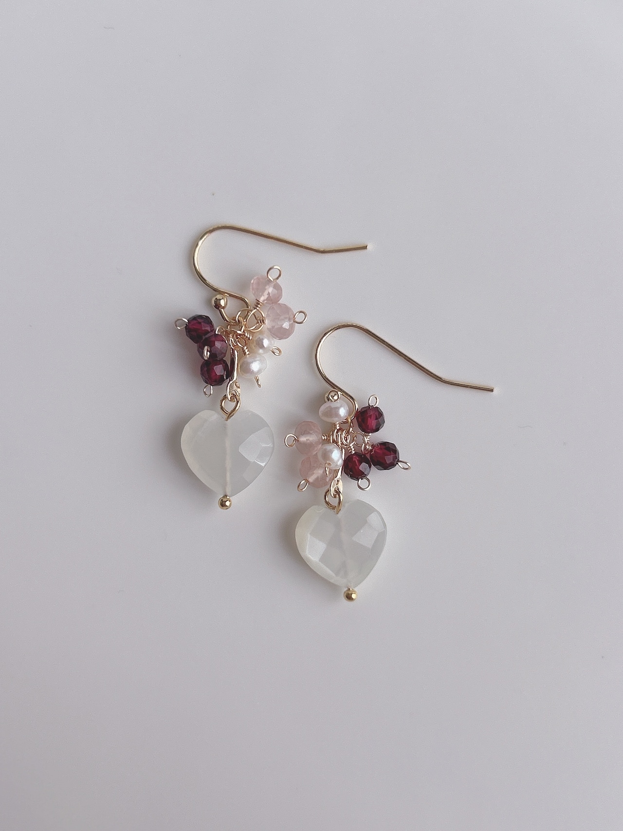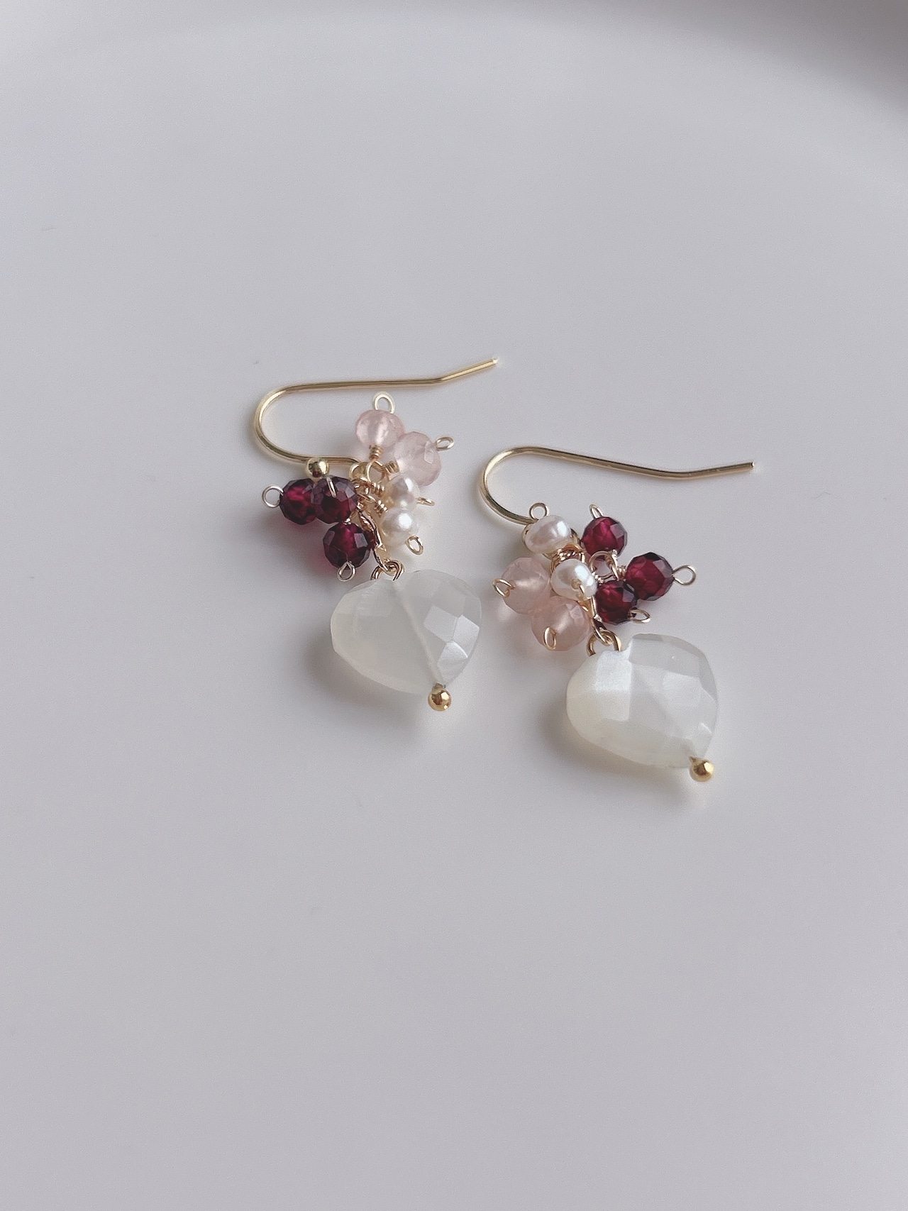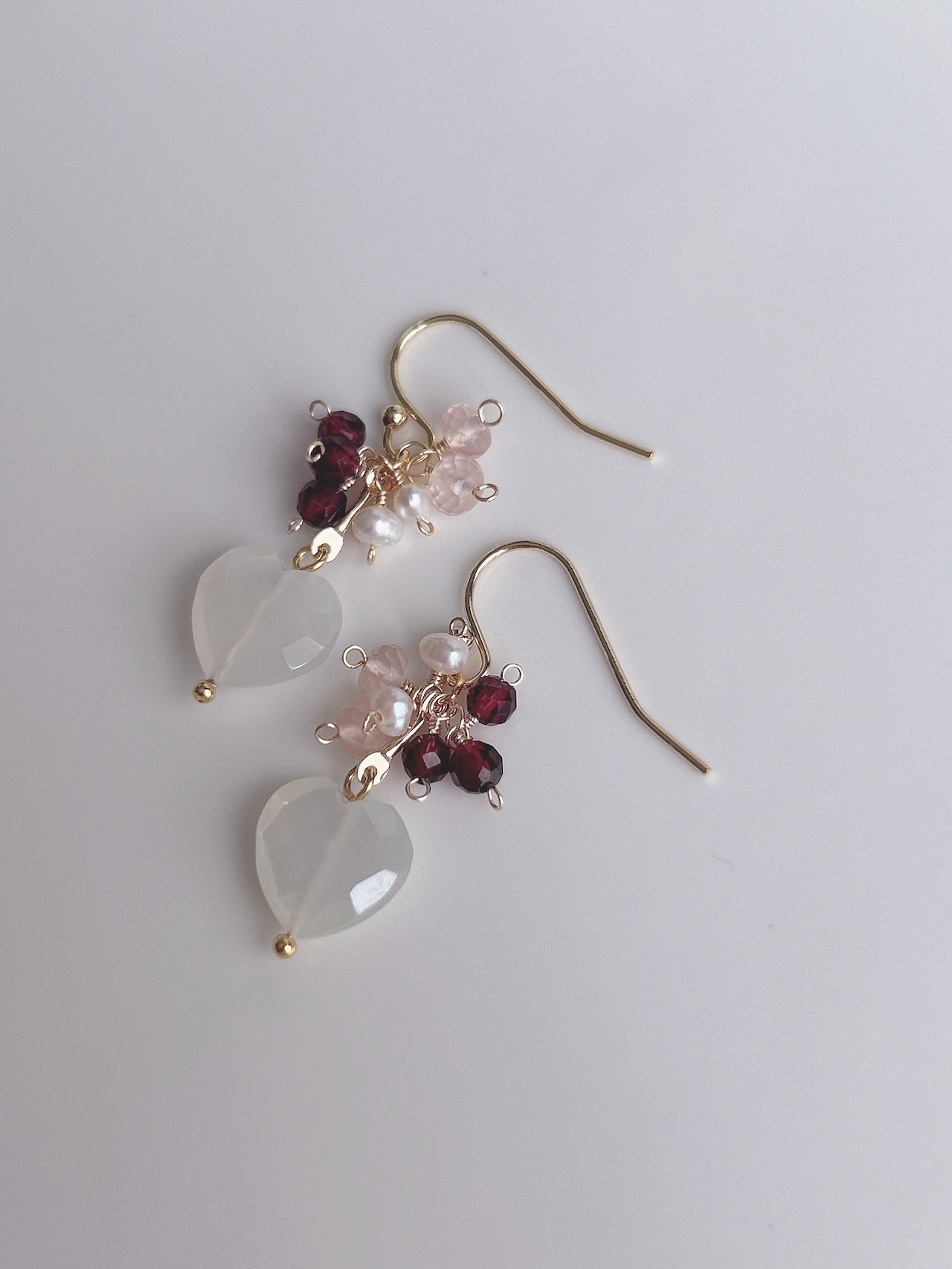 ホワイトムーンストーンのハートカットをメインに、ガーネット、ピンクカルセドニー、淡水パールを組み合わせたピアス/イヤリング。