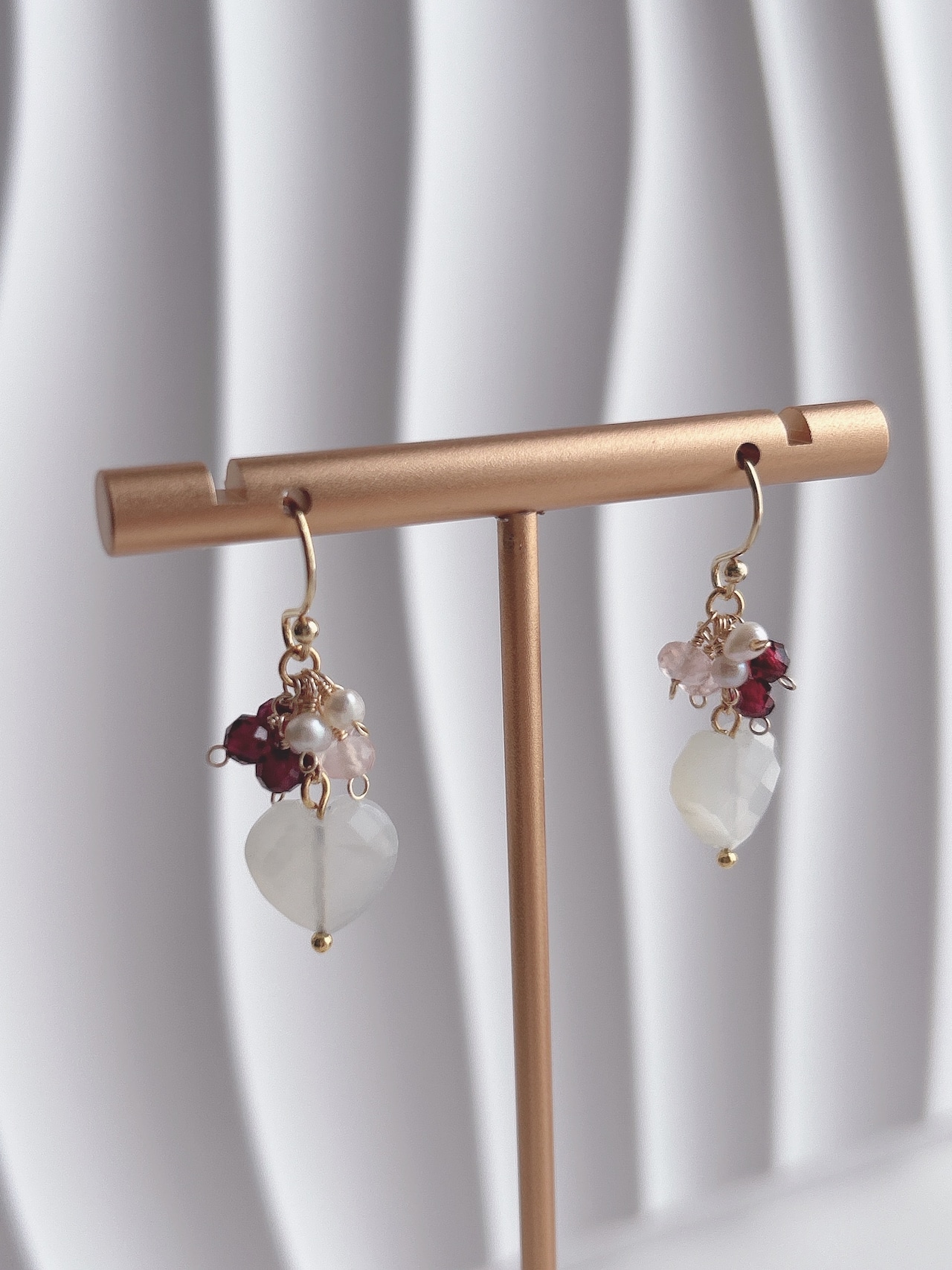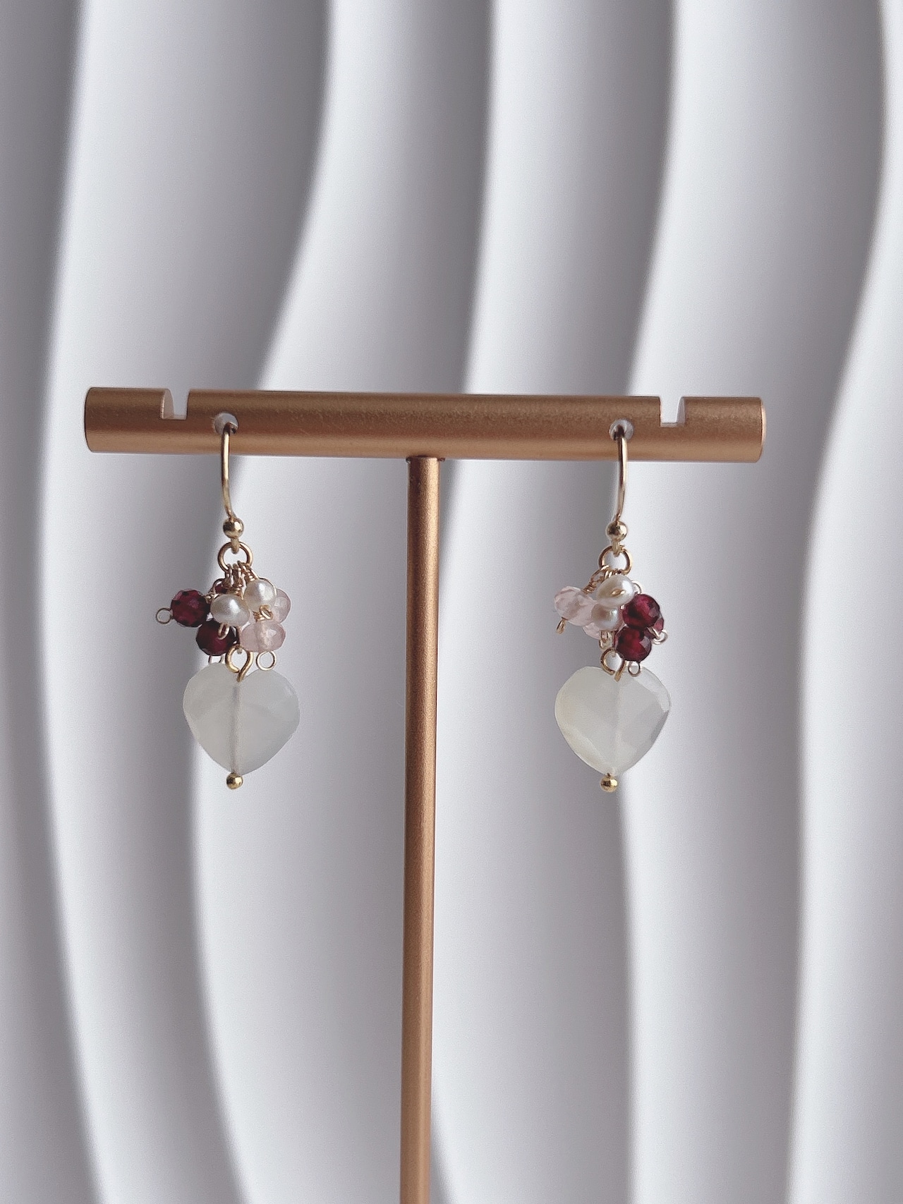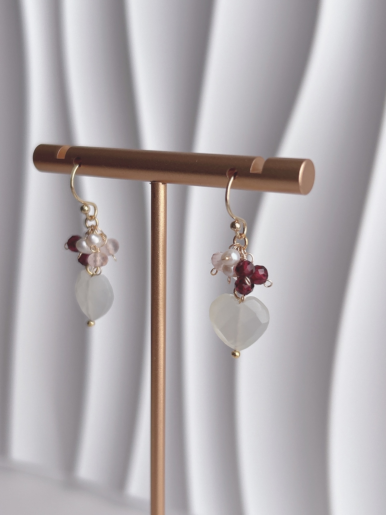 ホワイトムーンストーンのハートカットをメインに、ガーネット、ピンクカルセドニー、淡水パールを組み合わせたピアス/イヤリング。