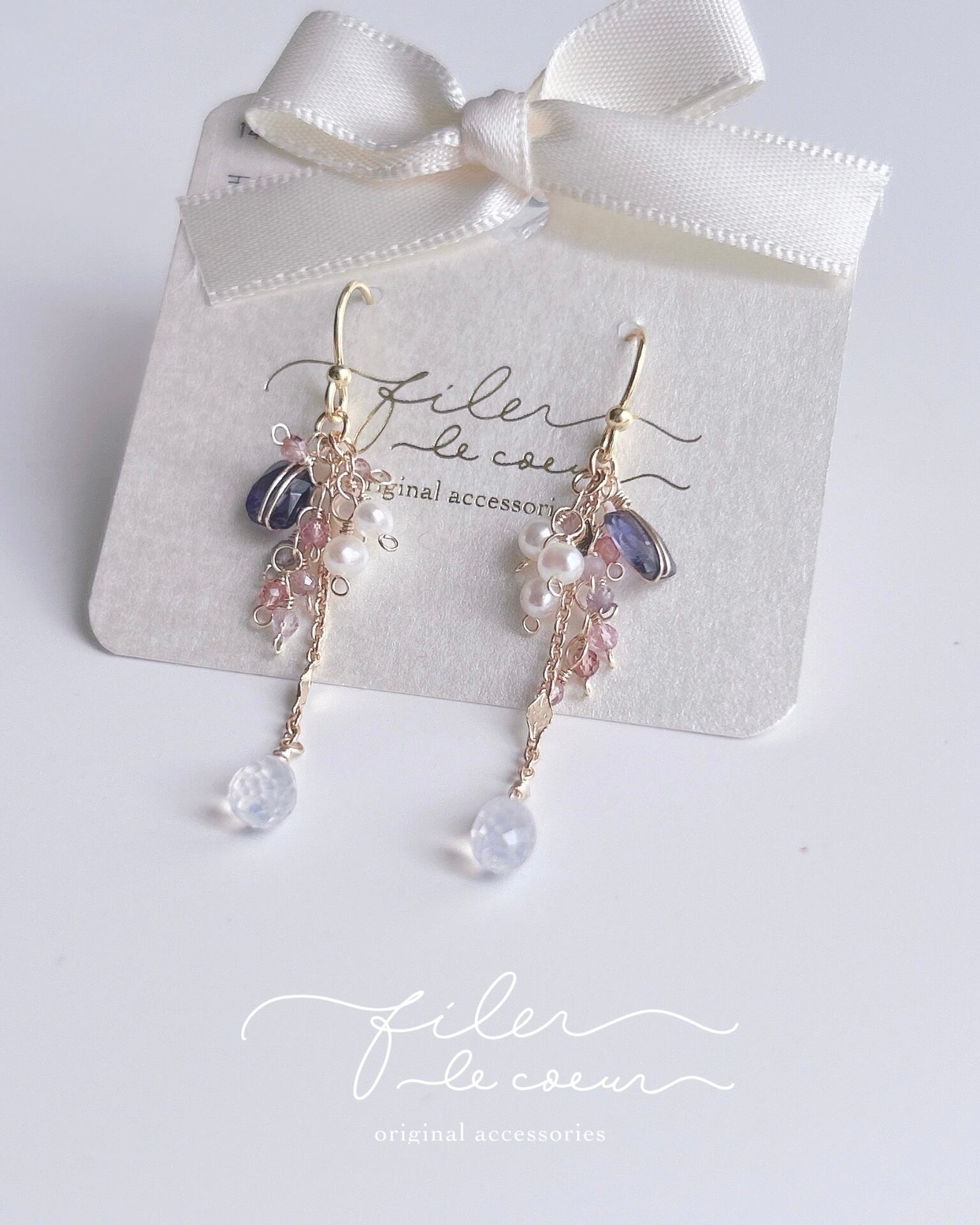 ・色彩豊かなアクセサリーを楽しみたい方 ・気分を明るくしたい方 ・大切な方へのプレゼントを考えている方 そんな方に寄り添い、日常に華やかさをプラスするお手伝いをします。しなやかな14KGFの金具が、天然石の輝きを引き立て、耳元を優しく飾ります。特に美しいスピネルの深い色合いと、アイオライト・スコロライトの透明感が、見る人の視線を捉えて離しません。