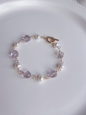 フリーダンブルカットのスモーキーアメシストと淡水パールを交互にワイヤーで丁寧に紡いだブレスレット。