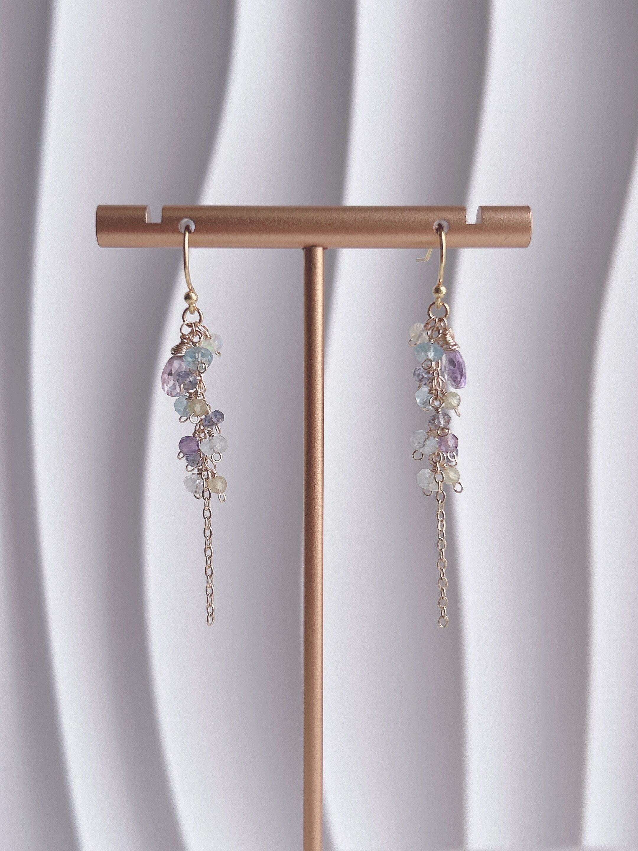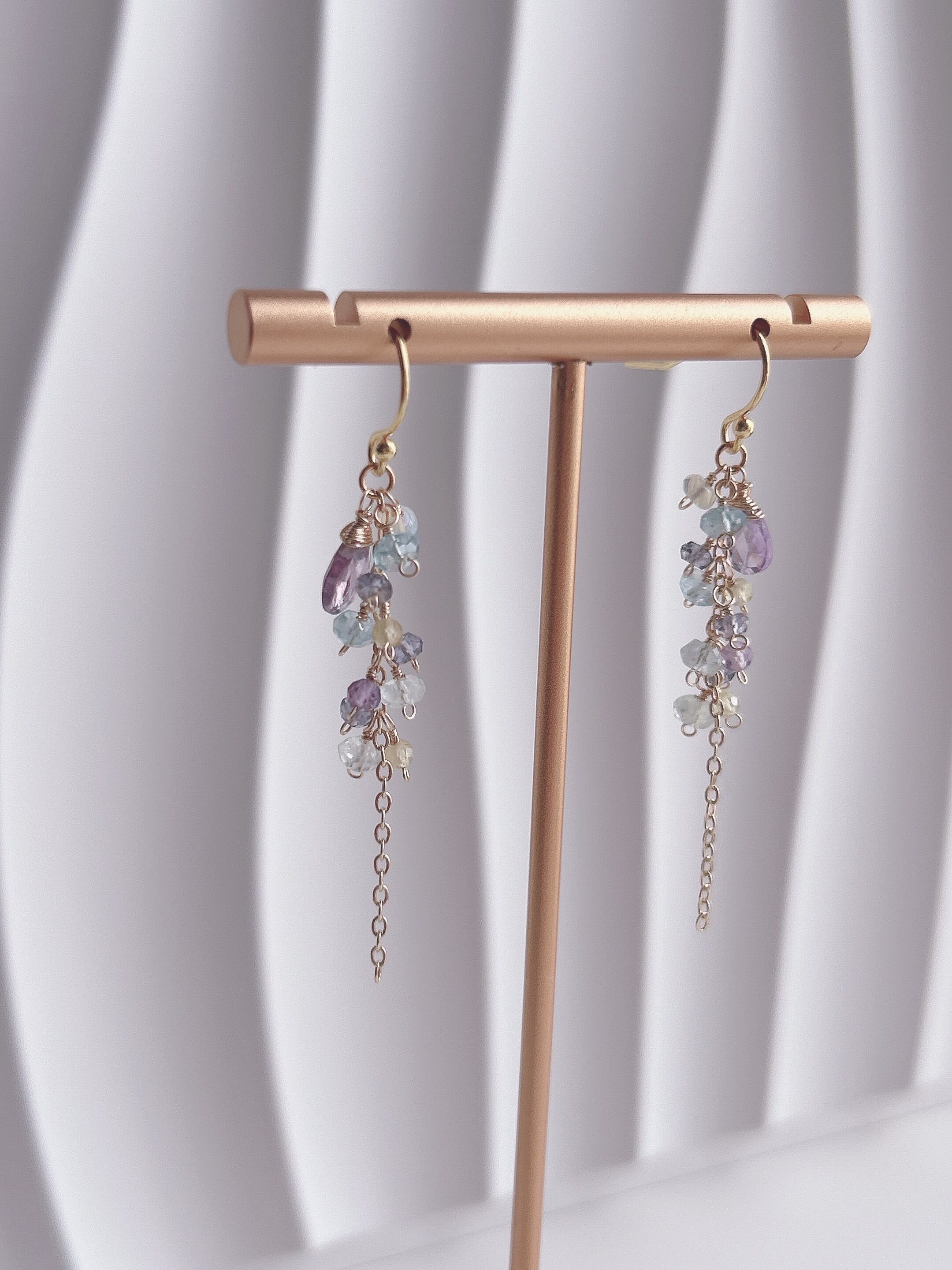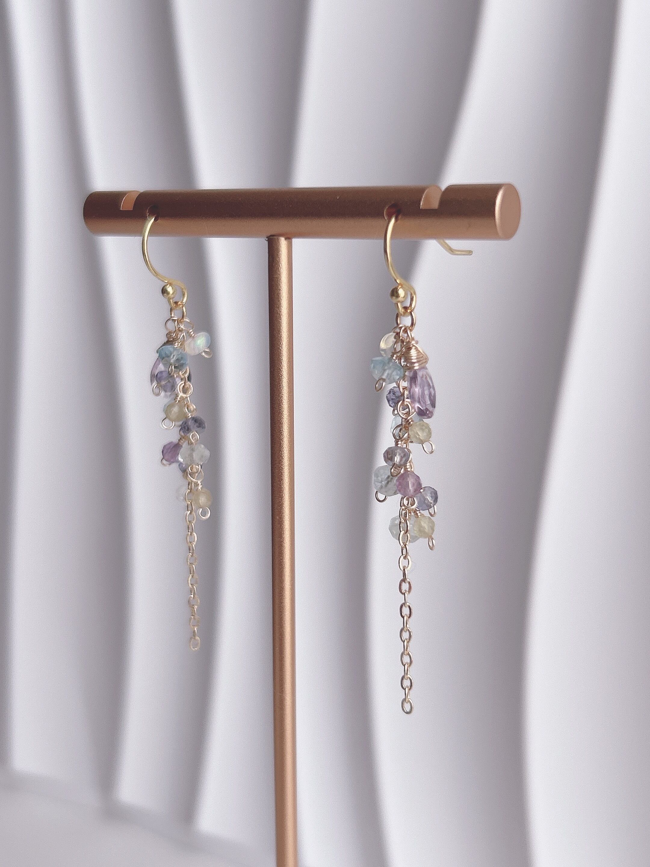 【14kgf】宝石質ピンクアメシストとアクアマリン、アイオライト、イエローオパール、エチオピアオパールのピアス/イヤリングꕤ