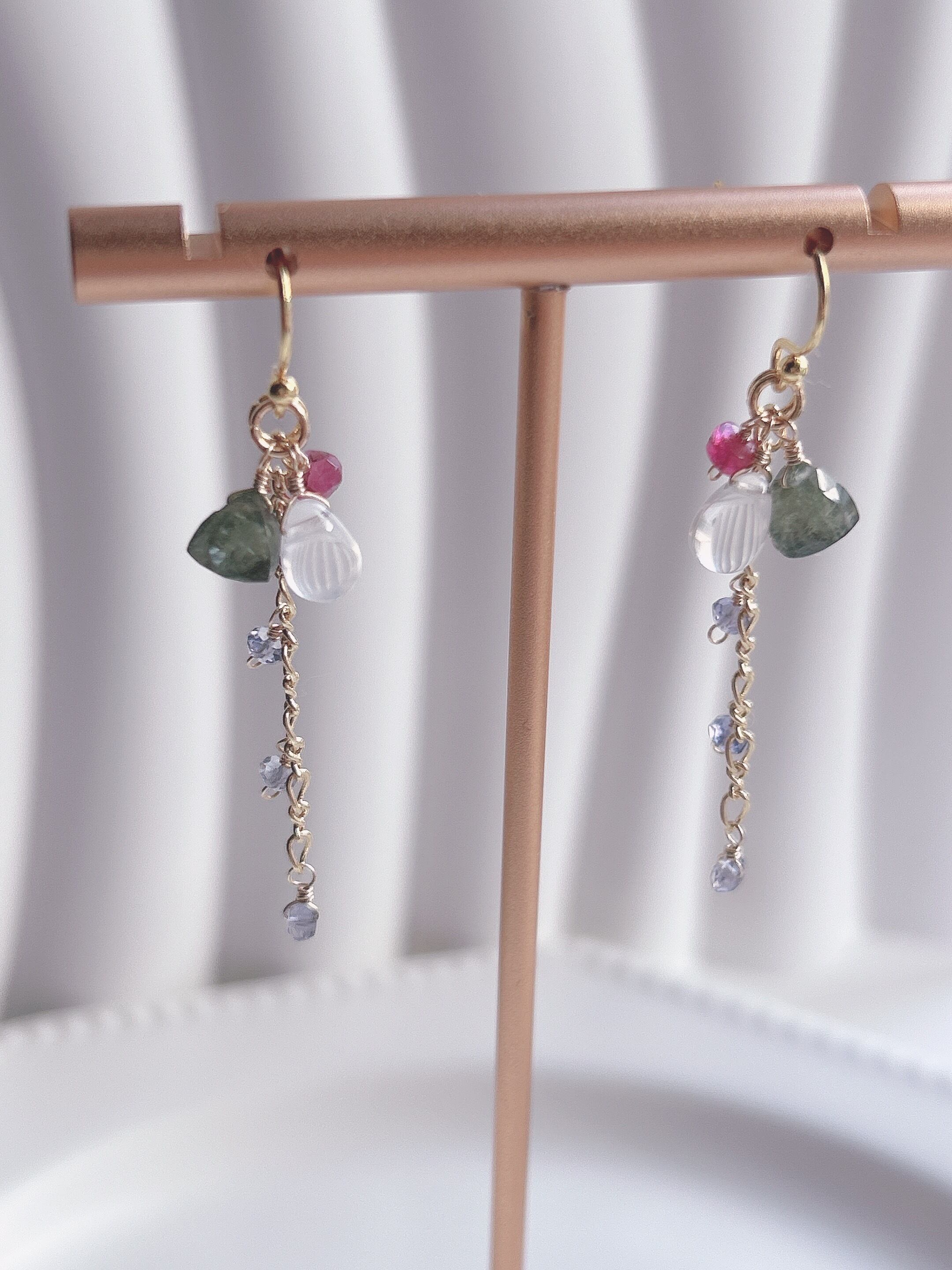 モスアクアマリンのトリリアンカットをメインに、アイスクォーツのドロップ、ピンクトルマリン、アイオライトを組み合わせたピアス/イヤリング。