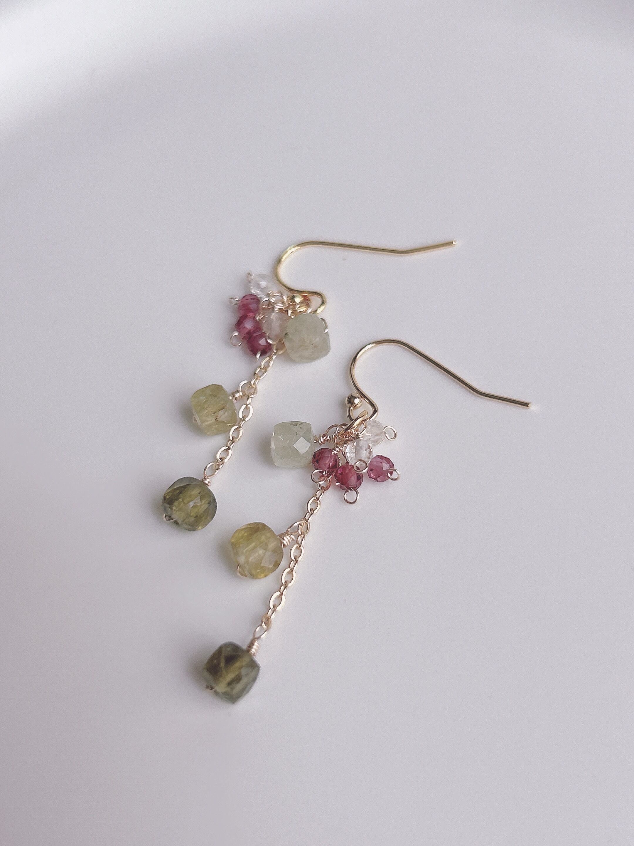 【14kgf】グロッシュラーガーネット(キューブ) × ピンクガーネット × 水晶 ピアス/イヤリング【深み&上品天然石】