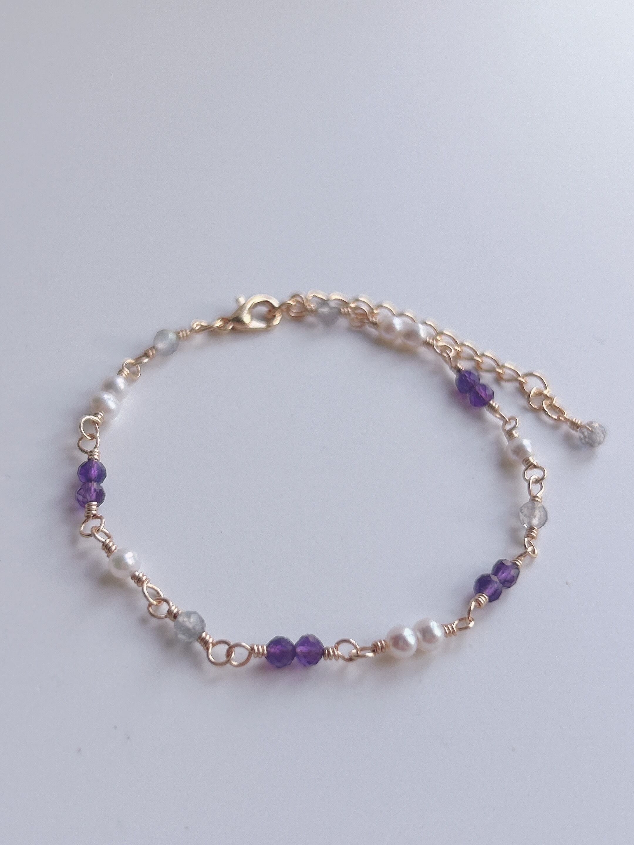 濃いアメシスト × ラブラドライト × 淡水パール ブレスレット【小粒で上品な癒しのワイヤーブレス】ꕤ