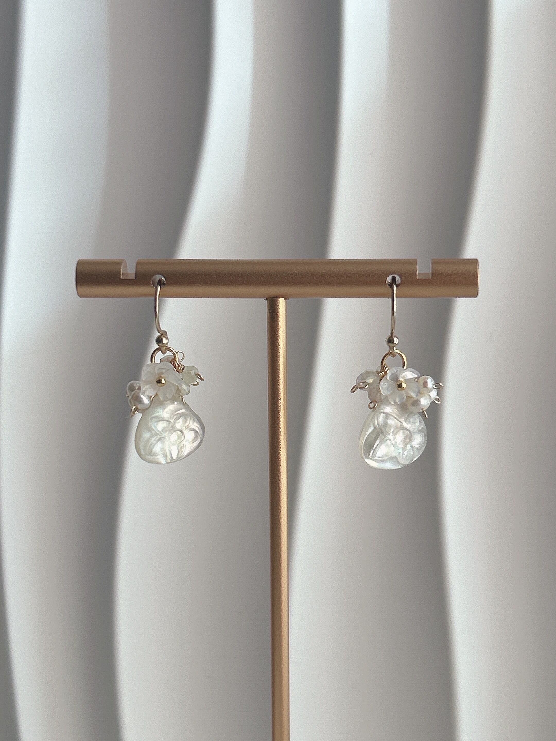 【14kgf】マザーオブパールと水晶トリプレットのフラワーカービング、淡水パール・モルガナイト・プレナイトのピアス/イヤリングꕤ