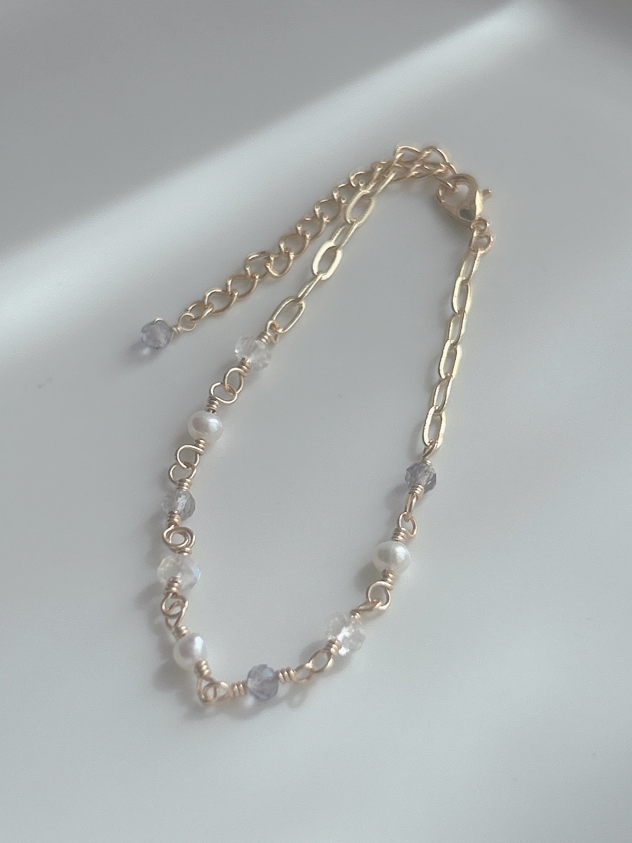 小粒のアイオライトとブルームーンストーン、淡水パールをあしらったチェーンブレスレットです。