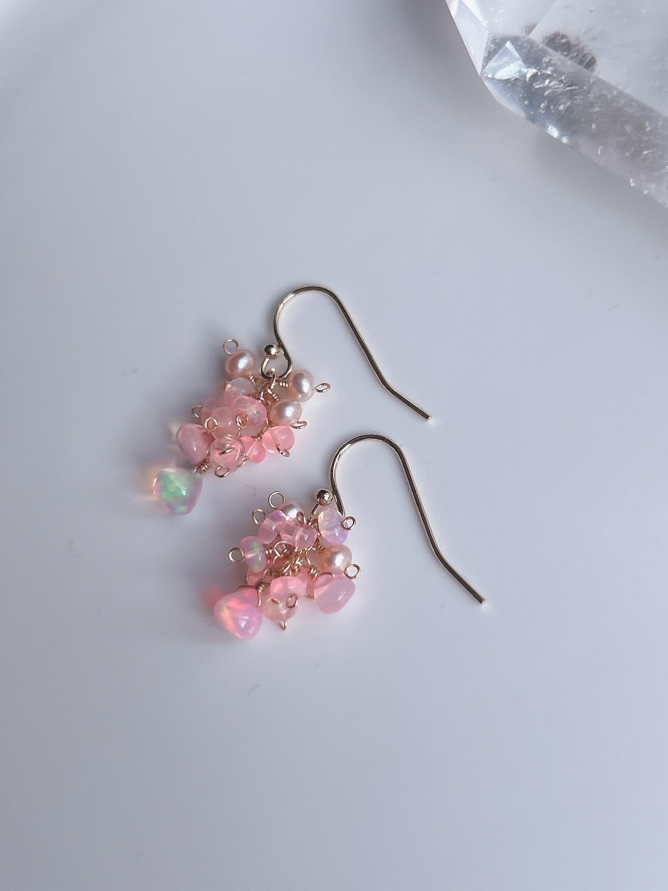 淡い遊色がふわっと浮かぶピンクカラーオパールの小粒と、