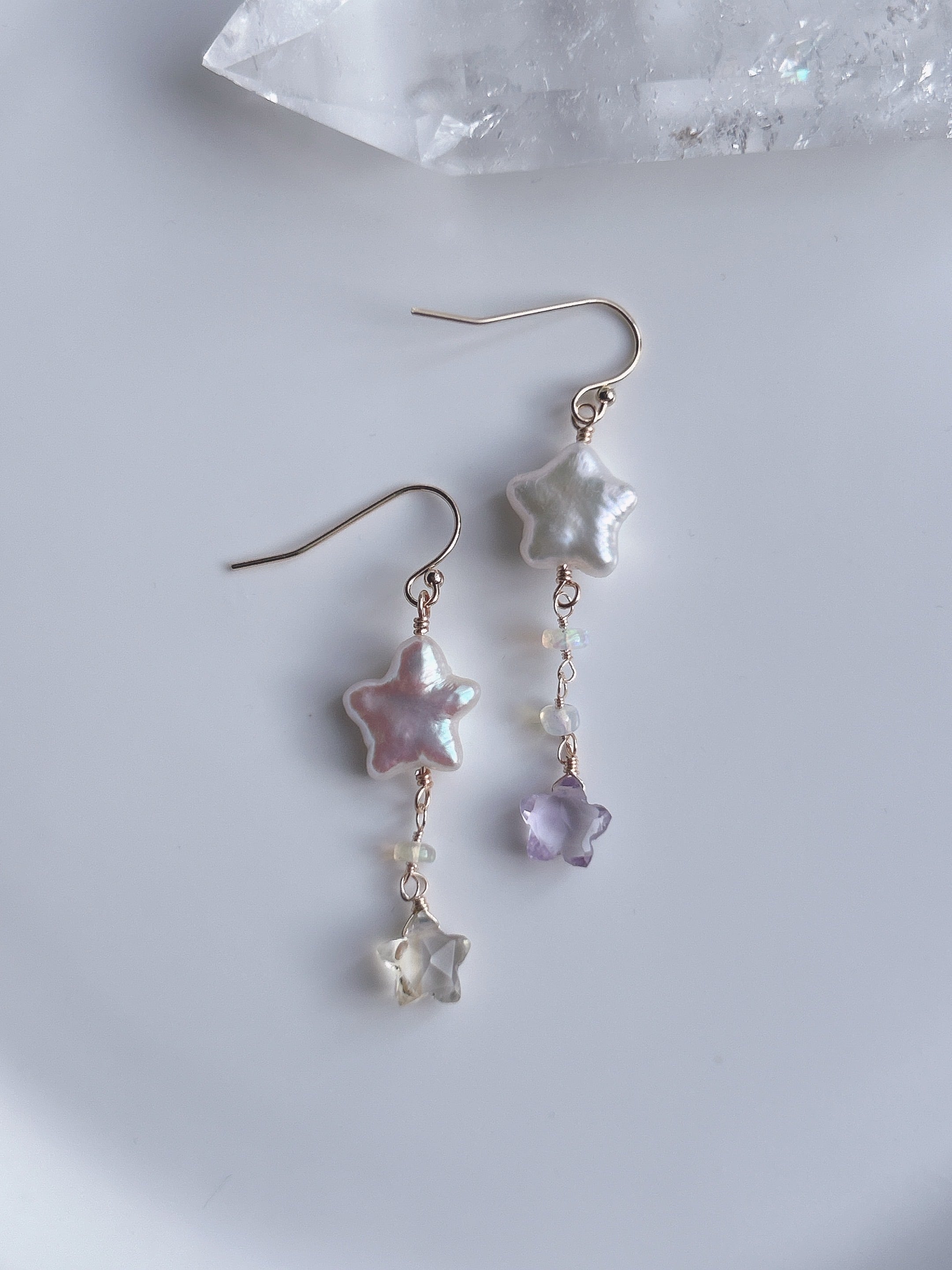 【14kgf】星形淡水パール × エチオピアオパール シトリン&アメシスト アシンメトリーピアス / イヤリングꕤ