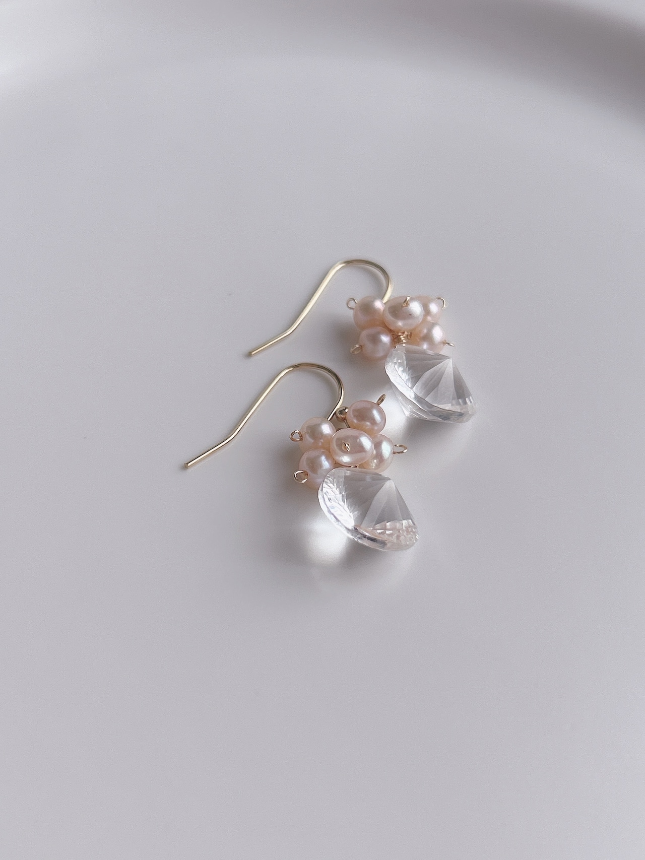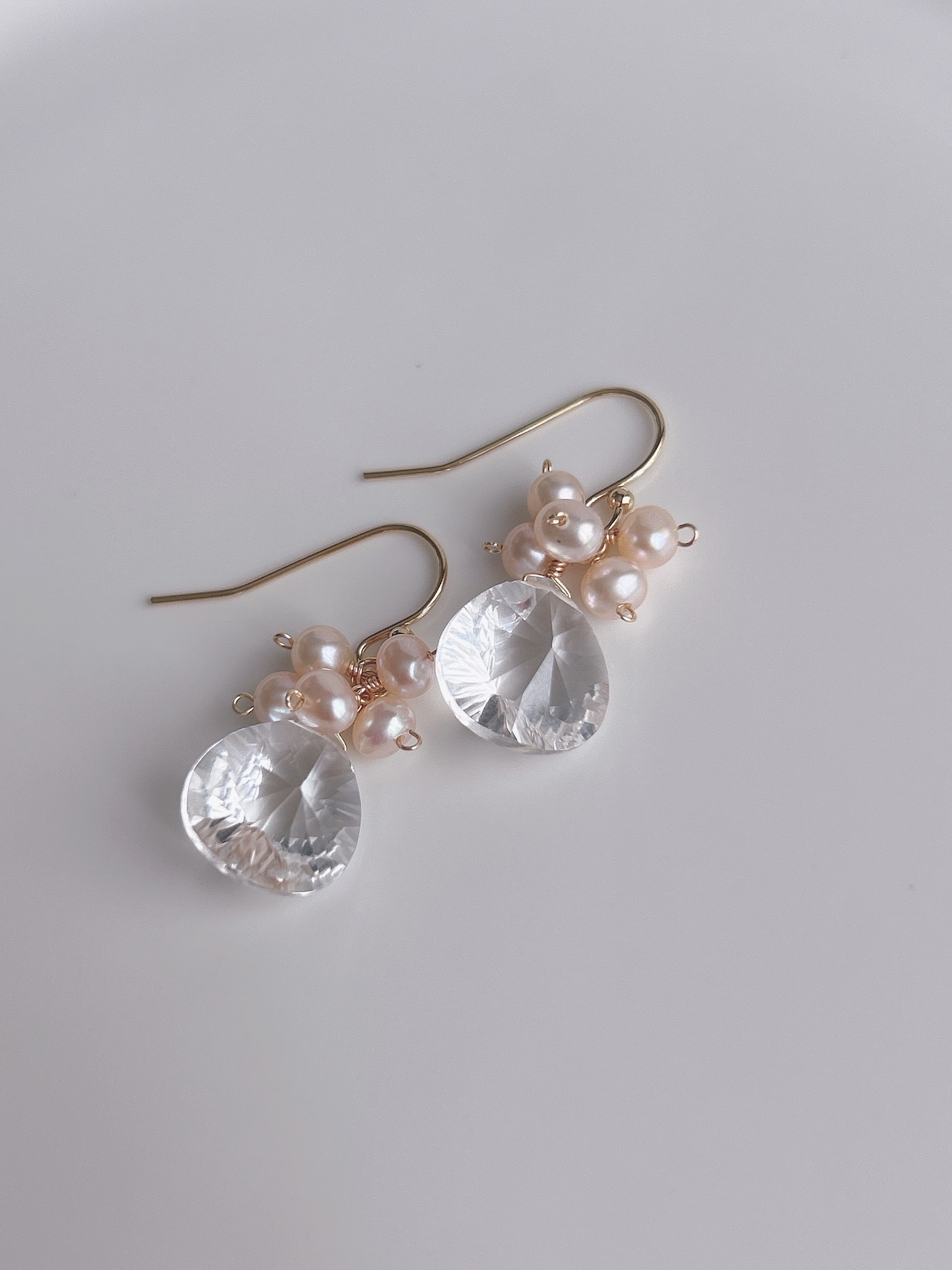 高品質水晶の両面コンケーブをメインに、高品質ピンク淡水パールを組み合わせたピアス/イヤリング。